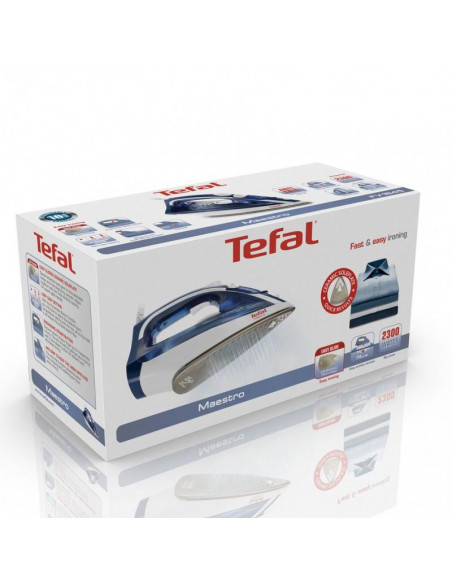 Tefal FV1845E0, Maestro 2. Modelo: Ferro a seco e a vapor, Soleplate type: Base em CeramicGlide, Comprimento do fio: 1,95 m. Potência: 2300 W. Peso do produto: 1,18 kg, Largura do produto: 122 mm, Profundidade da Unidade: 290 mm. Largura da palete: 80 cm, Comprimento da palete: 120 cm, Altura da palete: 124,8 cm ;