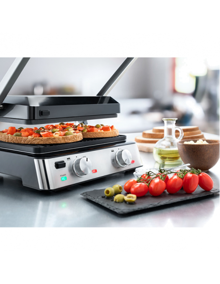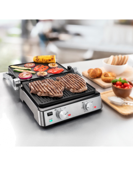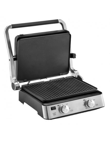 - 3 funções: grelhador de contacto & sanduíche; grelhador aberto a 180º, com uma placa ondulada e uma placa lisa; Ideal para cozinhar hambúrgueres, paninis e grelhar deliciosas carnes, peixes e legumes