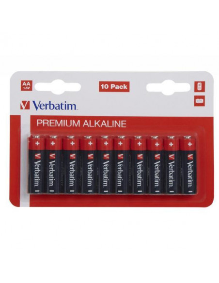 Pack de 10 pilhas alcalinas Verbatim AA (LR6), com voltagem de 1,5V. Ideal para diversos dispositivos eletrónicos portáteis. Dimensões compactas: 50,5mm de altura e 14,5mm de diâmetro.