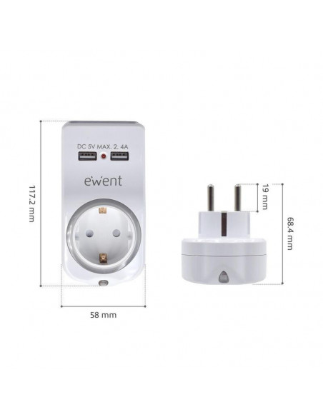 O carregador USB Ewent EW1225 4 em 1 oferece carregamento simultâneo para até dois dispositivos móveis, com tomada de corrente integrada. Inclui suporte para smartphone, luz noturna com sensor automático e proteção infantil.