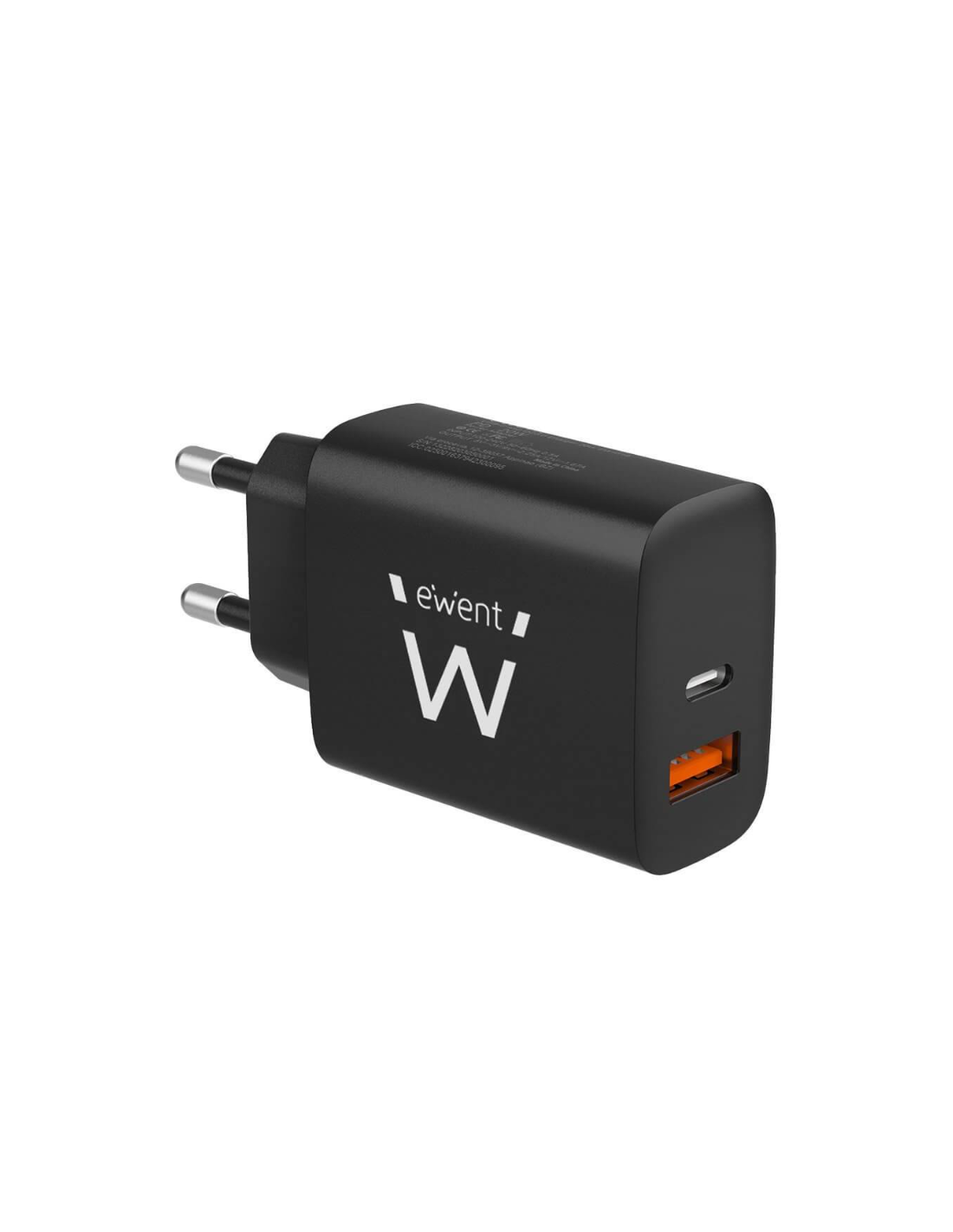 Carregador EWENT EW1319, 20W, com portas USB-C e USB-A para carregamento rápido de smartphones e tablets. Compatível com dispositivos com Power Delivery e carregamento rápido. Proteção contra sobrecorrente, sobretensão, sobreaquecimento e curto-circuito. Design compacto e carregamento simultâneo de dois dispositivos.