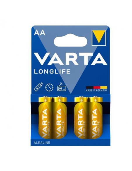 Conjunto de 4 pilhas alcalinas AA da VARTA, para alimentar diversos dispositivos eletrónicos. Tensão nominal de 1,5V.  Longa duração e desempenho consistente. Embalagem em blister. Não recarregáveis. Garantia de 24 meses.