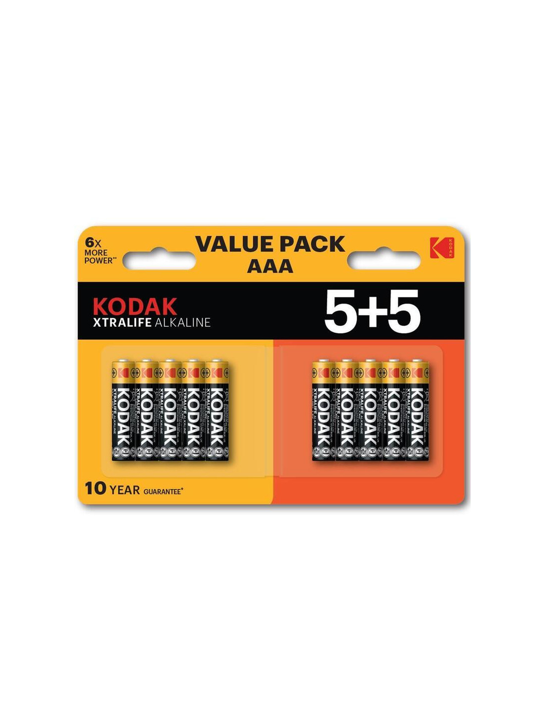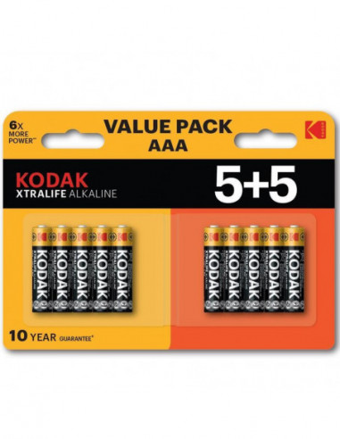 Pilhas alcalinas Kodak Xtralife AAA LR3, num blister com 10 unidades (5+5). Ideal para dispositivos eletrónicos que exigem longa duração da pilha.