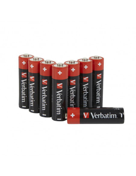 Pack de 8 pilhas alcalinas AA da Verbatim, ideais para dispositivos de baixo consumo.  Oferecem longa duração e desempenho confiável.  Não recarregáveis.