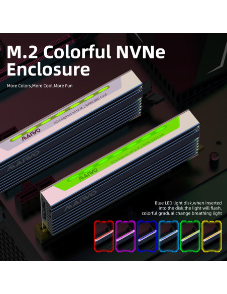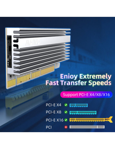 Este conversor de última geração da Maiwo oferece uma solução premium para adicionar um SSD M.2 NVMe ao seu sistema, através de um slot PCIe 5.0 (compatível com x16, x8 e x4). Equipado com um dissipador de alumínio e iluminação RGB, este conversor proporciona uma combinação de desempenho, estética e refrigeração otimizada. O conversor suporta os tamanhos de SSD M.2 mais comuns (2230, 2242, 2260 e 2280), permitindo uma grande flexibilidade na escolha da sua unidade. A compatibilidade com Windows, macOS e Linux torna este conversor uma solução ideal para uma vasta gama de utilizadores.