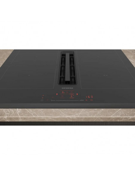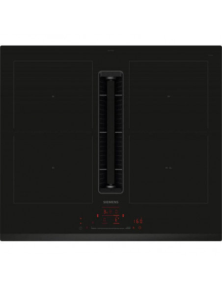 Placa de indução com ventilação integrada 60 cm Instalação na superfície sem moldura Maior flexibilidade para cozinhar com recipientes grandes. Ao utilizar recipientes grandes, a função combiZone permite conectar duas zonas de indução circulares, criando assim uma zona de confeção maior. Controlo de temperatura na ponta de um dedo. Agrada-lhe desfrutar da máxima comodidade ao utilizar a sua placa?Esqueça os botões: com o touchSlider, basta um simples toque ou deslizamento do dedo para controlar o nível de potência das suas zonas de confeção.A regulação do aquecimento faz-se em meios níveis até ao nível máximo de 9. Mais potência, menos ruído. Que tal uma solução sem compromissos? A placa inductionAir Plus garante uma potência de sucção efic(...)