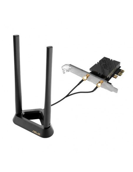Placa de rede ASUS PCE-BE92BT, com interface PCI Express, oferece conectividade Wi-Fi 7 (802.11be) tri-banda (2.4GHz/5GHz/6GHz) e Bluetooth 5.4.  Velocidade máxima de transferência de dados até 5764 Mbps. Inclui duas antenas externas e suporta o protocolo de segurança WPA3.  Compatível com Windows 11.
