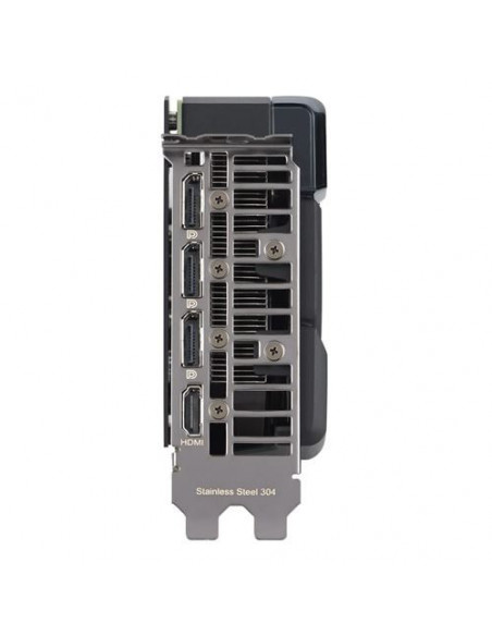 A conectividade é assegurada por 3 portas DisplayPort (versão 1.4a) e 1 porta HDMI (versão 2.1a), permitindo a ligação a múltiplos monitores e ecrãs de alta resolução. O suporte HDCP 2.3 garante a compatibilidade com conteúdos protegidos.
