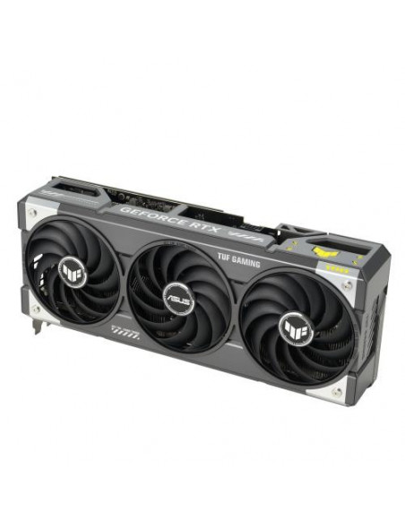 Um dos pontos fortes desta placa gráfica é o seu avançado sistema de arrefecimento. O sistema de arrefecimento ativo, com três ventoinhas Axial-tech da ASUS, garante que a placa permanece fria e silenciosa mesmo durante longas sessões de jogo. A iluminação RGB multi-color é outra característica marcante, permitindo personalizar o aspeto da placa para combinar com o estilo do seu setup. Com múltiplas portas de saída (2x HDMI 2.1b e 3x DisplayPort 2.1b), esta placa gráfica suporta até quatro monitores simultaneamente, ideal para setups multi-monitor ou para streaming ao vivo.