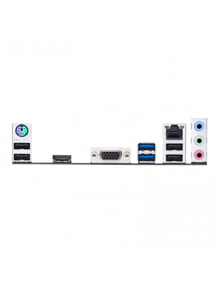 Para conetividade, a placa-mãe inclui uma porta Ethernet LAN Gigabit, fornecendo uma ligação de rede rápida e estável. No painel traseiro, a placa-mãe oferece várias portas USB, portas HDMI e VGA, proporcionando diversas opções para a ligação de periféricos e ecrãs.