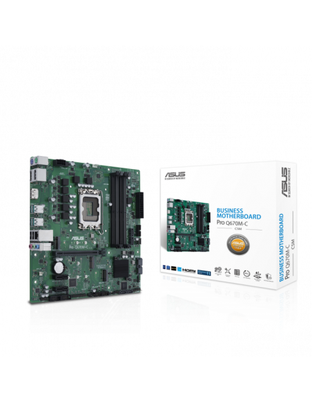 A Motherboard ASUS PRO Q670M-C-CSM é uma placa-mãe de alto desempenho, projetada para computadores de secretária (PC) no formato micro ATX. Esta placa-mãe é compatível com uma ampla gama de processadores Intel® com socket LGA 1700, incluindo modelos Intel® Celeron®, Core™ i3, i5, i7 e i9, bem como Intel Pentium G, oferecendo uma excelente flexibilidade para diversas necessidades de computação.
