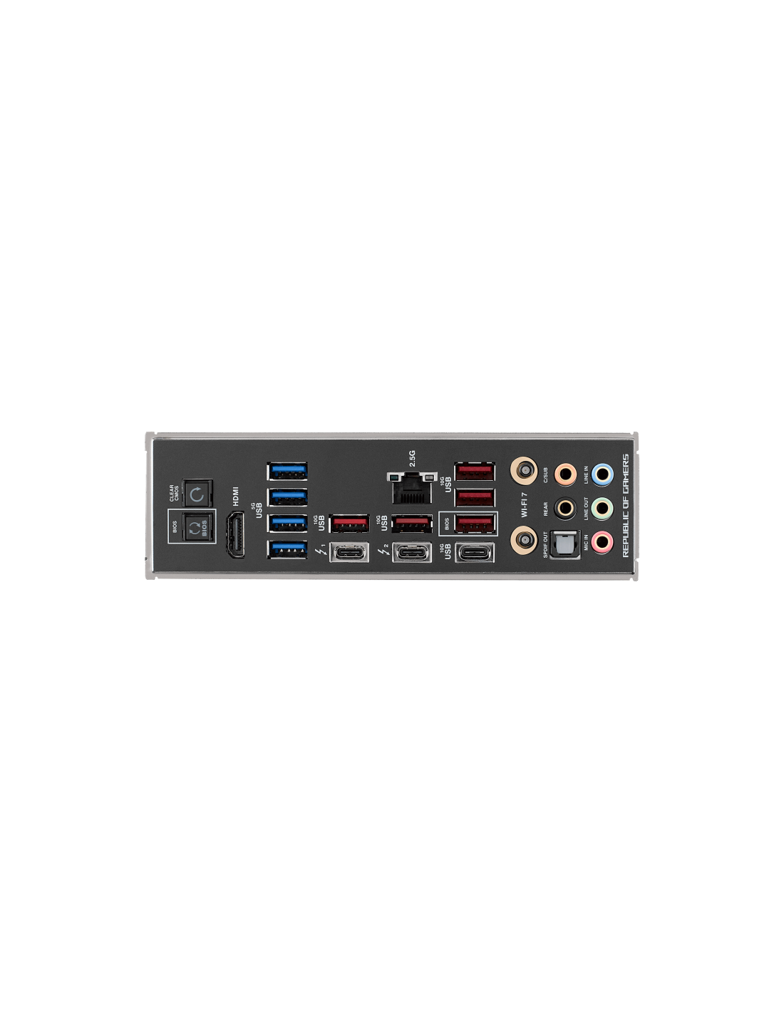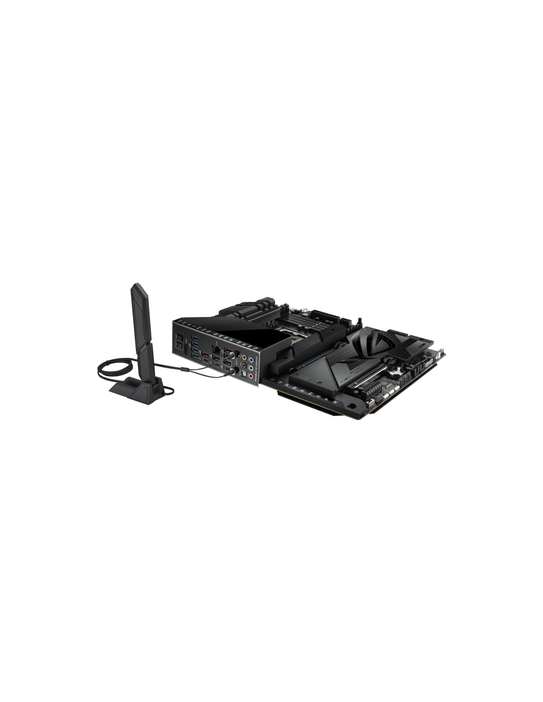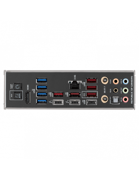 Para conectividade, a ROG MAXIMUS Z790 DARK HERO integra uma placa de rede 2.5 Gigabit Ethernet, Wi-Fi 7 (802.11be) e Bluetooth 5.4, assegurando ligações rápidas e estáveis. Na parte traseira, oferece diversas portas USB 3.2 Gen 1 e Gen 2, portas HDMI, portas Thunderbolt e conectores para antenas Wi-Fi.