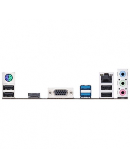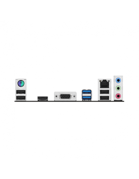 Em termos de conectividade, esta motherboard está equipada com Gigabit Ethernet, que fornece uma conexão de rede rápida e confiável. As portas traseiras incluem múltiplas portas USB 2.0 e USB 3.2 Gen 1 (3.1 Gen 1) Tipo A, oferecendo ampla conectividade para periféricos. Além disso, possui portas HDMI e VGA para flexibilidade na saída de vídeo. O painel traseiro I/O também inclui portas de áudio, incluindo entrada e saída de microfone.