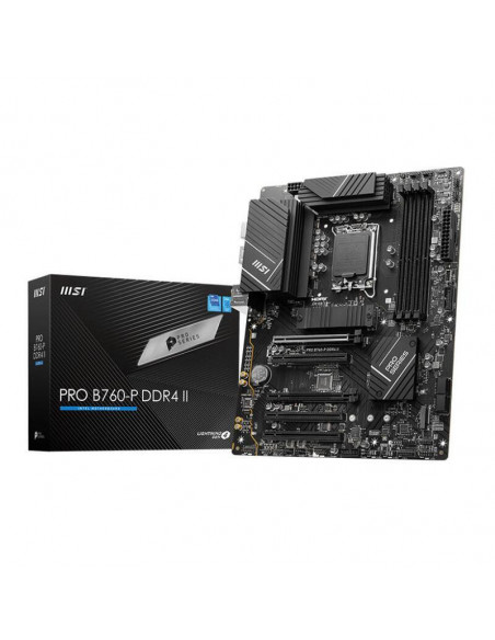 Placa-mãe MSI PRO B760-P DDR4 II, para processadores Intel de 12ª e 13ª geração.  Oferece suporte a memória DDR4 até 128GB, várias opções de conectividade e slots PCIe. Formato ATX. Características principais: