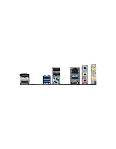As opções de conectividade incluem múltiplas portas USB, com destaque para 4 portas USB 3.2 Gen 1 (3.1 Gen 1) e uma porta USB 3.2 Tipo-C. A placa inclui também conectores de áudio, vídeo (HDMI e DVI-D), e portas PS/2. Para expansão, a placa dispõe de uma ranhura PCI Express x1 e uma ranhura PCI Express x16. O formato micro ATX (230mm x 201mm) torna-a ideal para construções compactas de PC.