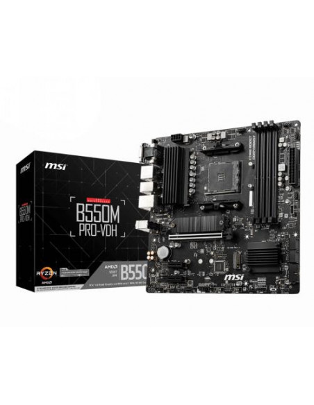 A placa-mãe MSI B550M PRO-VDH é uma solução micro ATX concebida para processadores AMD Ryzen de 5ª, 7ª e 9ª geração (3ª geração), utilizando a socket AM4. Esta placa-mãe suporta memória DDR4-SDRAM com velocidades de relógio entre 1866 MHz e 4400 MHz, com capacidade máxima de 128 GB distribuída por quatro slots DIMM. Oferece suporte a canais de memória dual-channel para melhor desempenho.