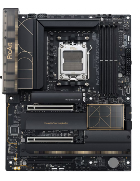 A Motherboard ASUS ProArt X870E-Creator é uma placa-mãe de alto desempenho projetada para criadores de conteúdo e profissionais que necessitam de um sistema robusto e versátil. A placa-mãe suporta processadores AMD Ryzen™ das séries 7000/8000/9000, oferecendo uma plataforma poderosa para tarefas exigentes como edição de vídeo, design gráfico e modelagem 3D. O seu design elegante com detalhes dourados e a tampa I/O translúcida, combinam com a funcionalidade avançada.