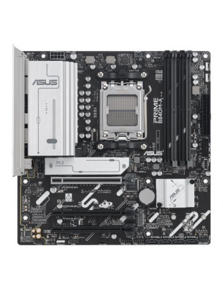 A ASUS Prime B840M-A-CSM é uma placa-mãe micro-ATX concebida para oferecer um excelente equilíbrio entre desempenho e valor. Compatível com os processadores AMD Ryzen das séries 7000, 8000 e 9000, via socket AM5, esta placa-mãe é uma solução ideal para quem deseja construir um sistema potente e eficiente num formato mais compacto. O suporte para memória DDR5-SDRAM permite atingir velocidades de até 7600 MHz, permitindo a utilização de até 192GB de memória RAM. A arquitetura de memória de canal duplo garante um acesso rápido e eficiente aos dados.