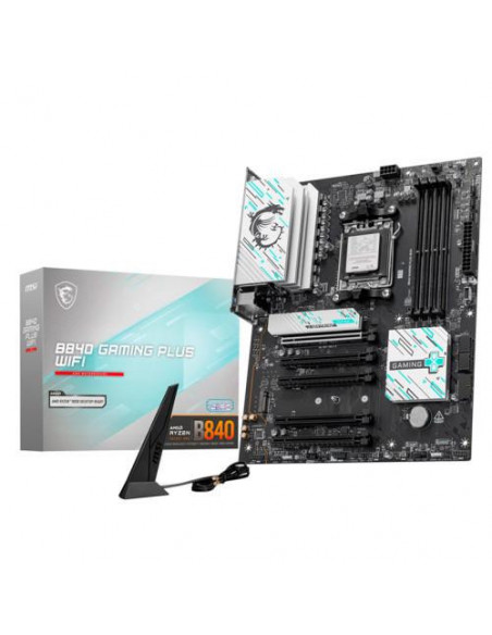 Placa-mãe MSI B840 Gaming Plus WIFI, compatível com processadores AMD AM5. Oferece suporte a memória DDR5, possui conectividade Wi-Fi 7 e Bluetooth 5.4, e conta com vários conectores USB, incluindo USB Type-C. Design ATX com iluminação Aura. Ideal para gamers e entusiastas.