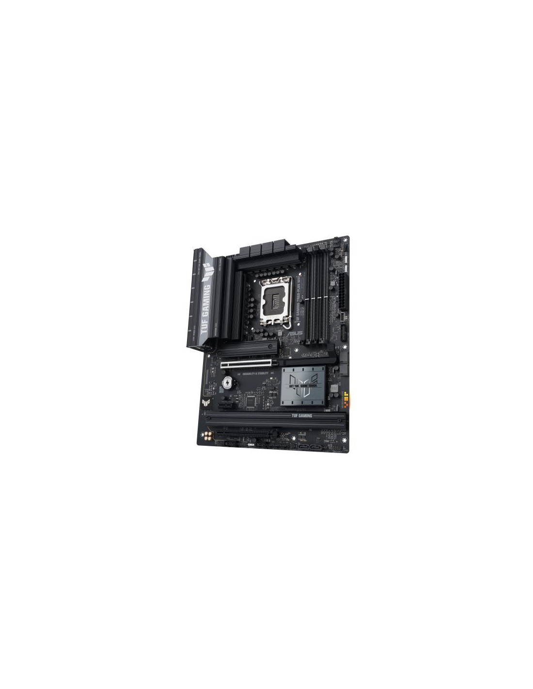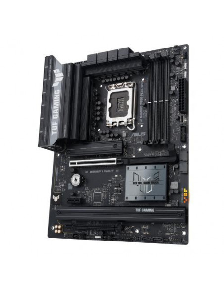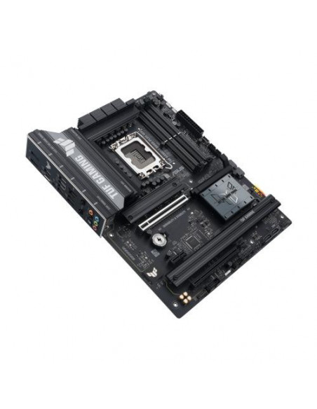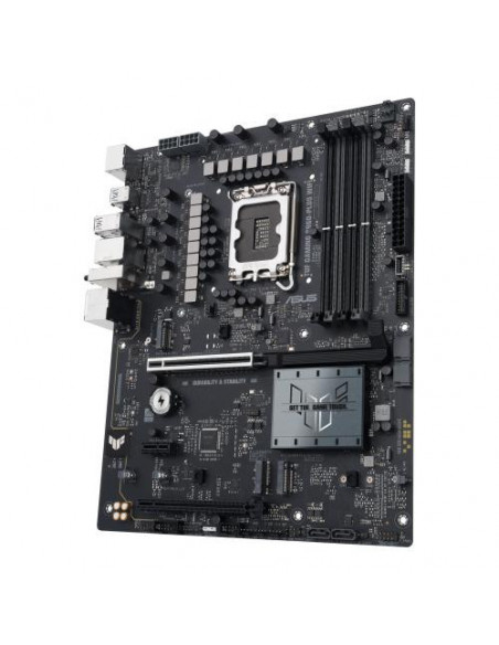 Placa-mãe ASUS TUF Gaming B860-Plus WiFi, com socket LGA 1851 para processadores Intel Core Ultra série 2. Suporta memória DDR5, conectividade WiFi 7 e Ethernet 2.5 Gigabit. Design ATX com slots M.2, vários conectores USB, incluindo 10Gbps, e suporte para RAID. Ideal para gamers e entusiastas.