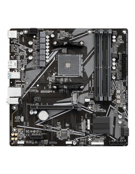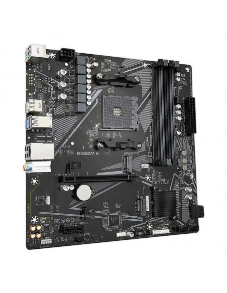 Placa-mãe Gigabyte B550M K, com socket AM4 para processadores AMD Ryzen 5. Suporta até 128GB de RAM DDR4 e oferece múltiplas opções de armazenamento, incluindo M.2, PCI Express 3.0 e 4.0 e SATA. Conectividade Gigabit Ethernet e múltiplas portas USB.