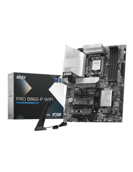 Placa-mãe MSI PRO B860-P WIFI para processadores Intel, socket LGA 1851. Suporta memória DDR5. Inclui conectividade Wi-Fi 7 e portas USB 10Gbps. Formato ATX.