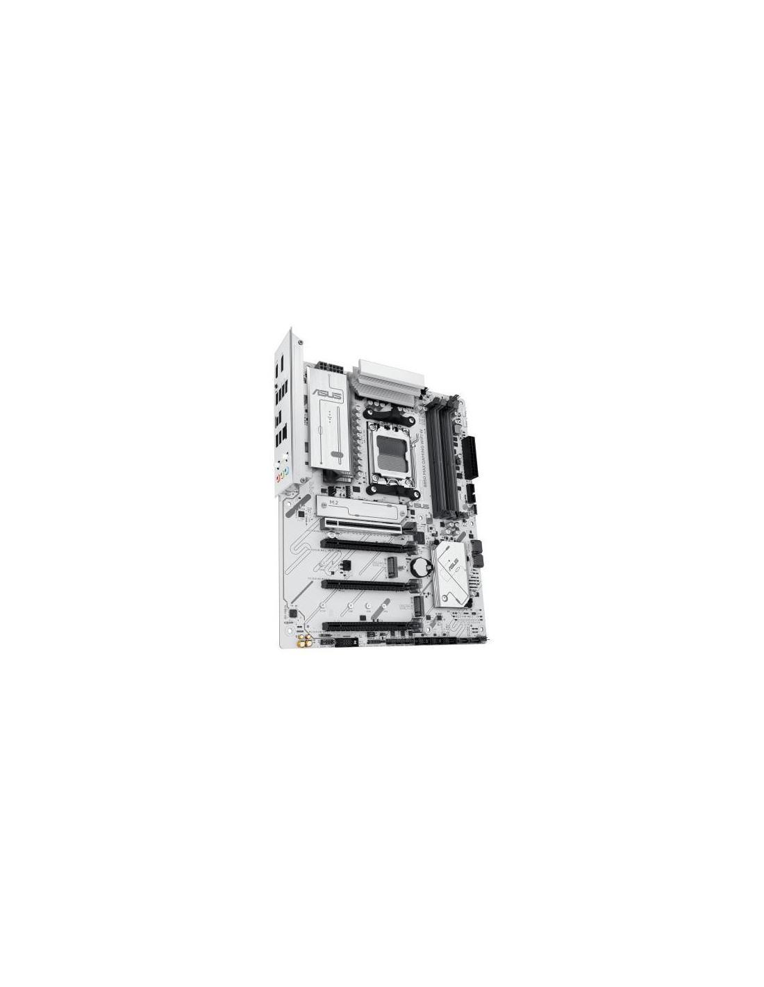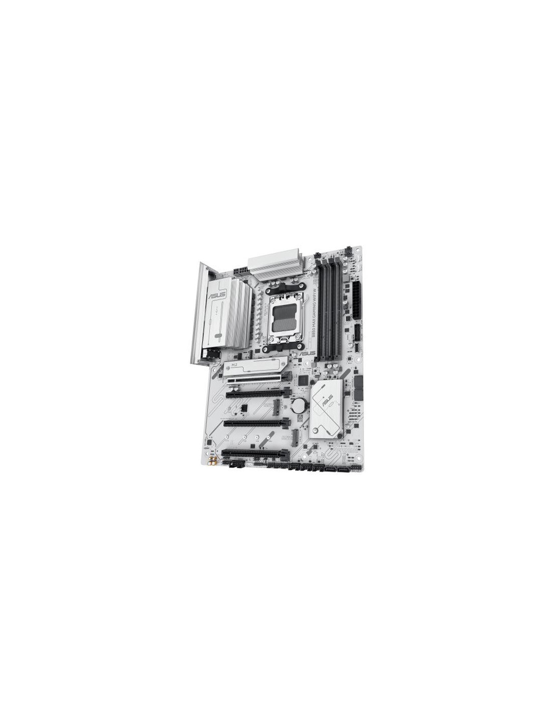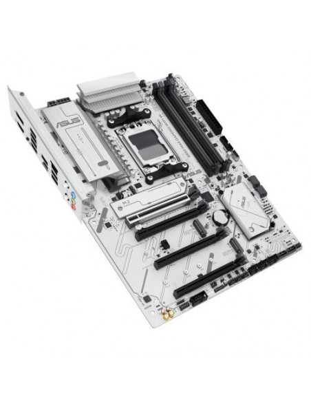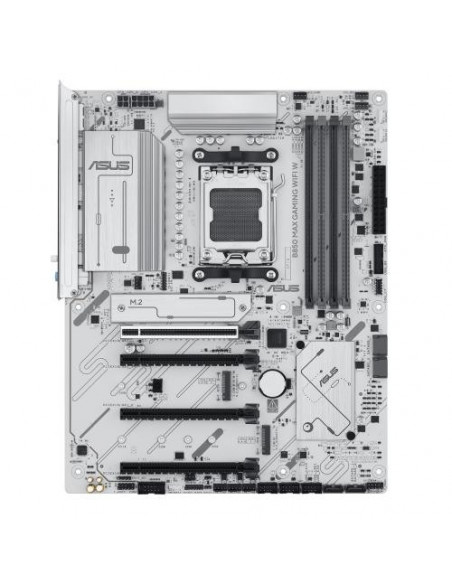 Placa-mãe Asus B850 MAX GAMING WIFI, modelo 90MB1M10-M0EAY0, para processadores AMD Ryzen 7000, 8000 e 9000 Series, socket AM5. Suporta até 256GB de memória DDR5 em quatro slots DIMM. Inclui conectividade Gigabit Ethernet (2.5GB), Wi-Fi 6E e Bluetooth 5.3. Apresenta saídas de vídeo HDMI e DisplayPort, e múltiplas opções de armazenamento com 4 portas SATA3 e 3 slots M.2. Design ATX em cor branca.