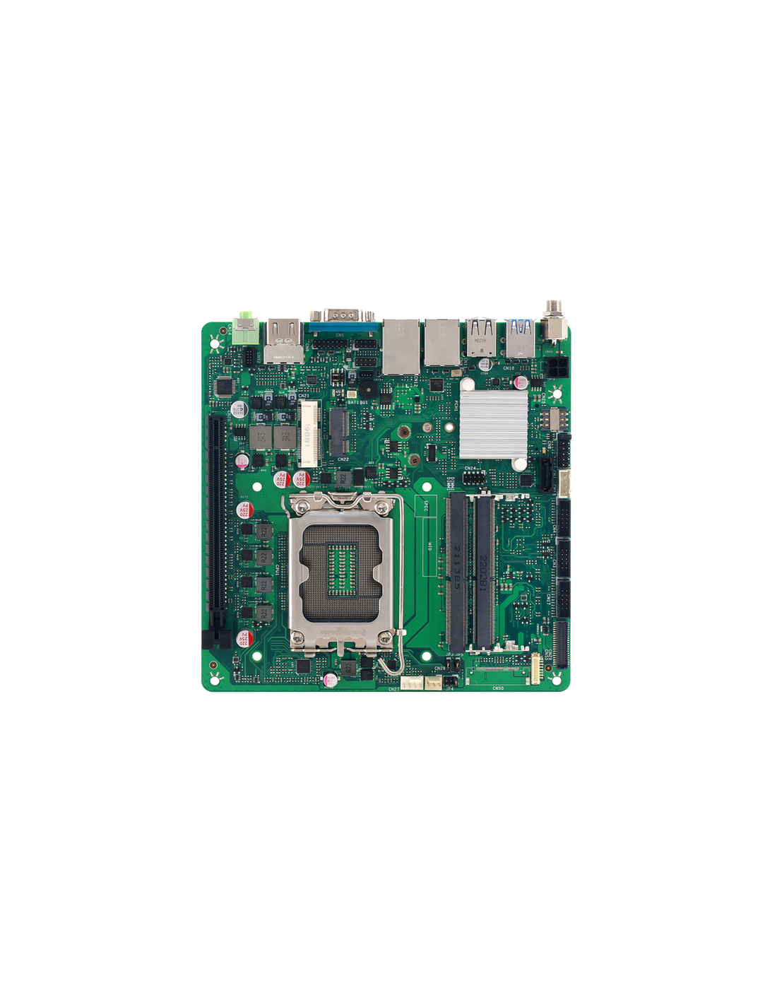 Motherboard Mini‑ITX LGA1700, suporta Intel 12ª/13ª Gen, até 64 GB DDR4, Quad Display, 2.5G+1G LAN, USB 3.2/2.0 e slots M.2/Mini PCIe.