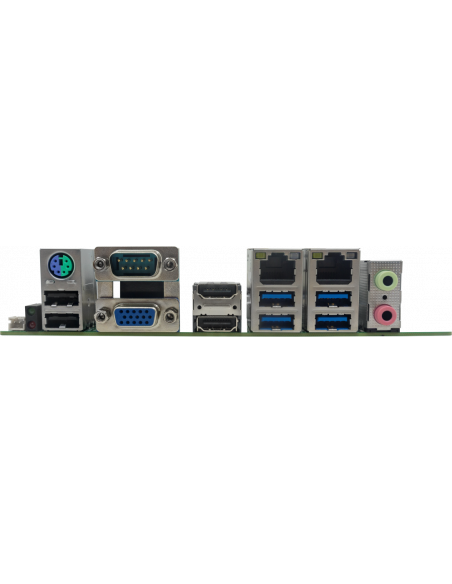 Esta placa-mãe oferece suporte para até 32GB de memória DDR4 através de dois slots SO-DIMM. O armazenamento é flexível, com duas interfaces SATA3.0 e uma slot mSATA para SSDs. A conectividade é um dos seus pontos fortes, com duas portas Gigabit Ethernet, múltiplas portas USB 3.0 e 2.0, seis portas COM e uma porta LPT. A placa também inclui slots de expansão PCIe x16 e Mini-PCIe, permitindo a instalação de placas de expansão para maior funcionalidade.