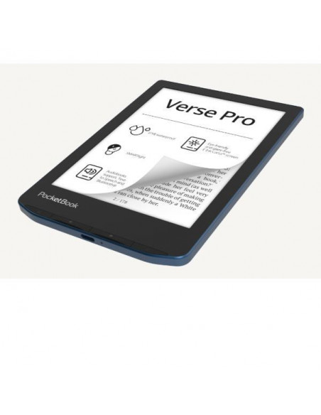 O leitor de ebooks PocketBook Verse Pro, na elegante cor azul, proporciona uma experiência de leitura imersiva e sem fadiga visual. O seu ecrã tátil E-Ink de 6 polegadas (758 x 1024 pixels) com 16 tons de cinza garante conforto e ausência de reflexos, mesmo em condições de forte luminosidade. A navegação intuitiva e a interação com o conteúdo são facilitadas pelo ecrã tátil responsivo.  A tecnologia E-Ink simula a experiência de leitura em papel, reduzindo a fadiga ocular e permitindo longas sessões de leitura sem desconforto.