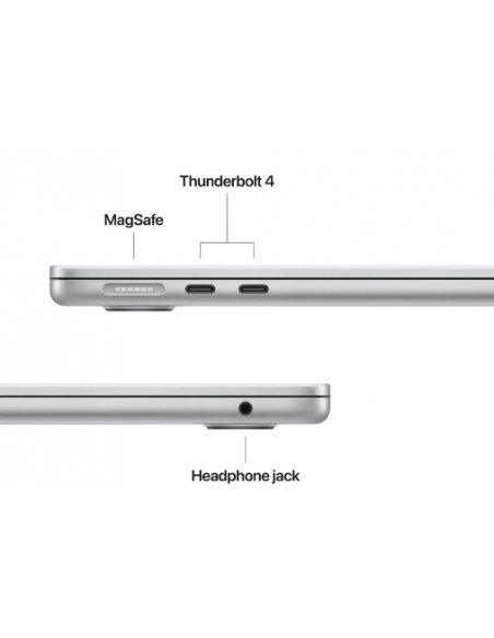 A conectividade inclui duas portas Thunderbolt USB 4 (USB-C) para transferência de dados, carregamento e ligação a ecrãs externos. Possui também uma saída para auscultadores de 3,5 mm e porta de carregamento MagSafe 3, que facilita o carregamento e aumenta a segurança. A câmara 12MP Center Stage e os microfones integrados proporcionam uma excelente qualidade de imagem e som para videochamadas. A conetividade Wi-Fi 6E e Bluetooth 5.3 garantem ligações rápidas e estáveis.