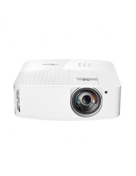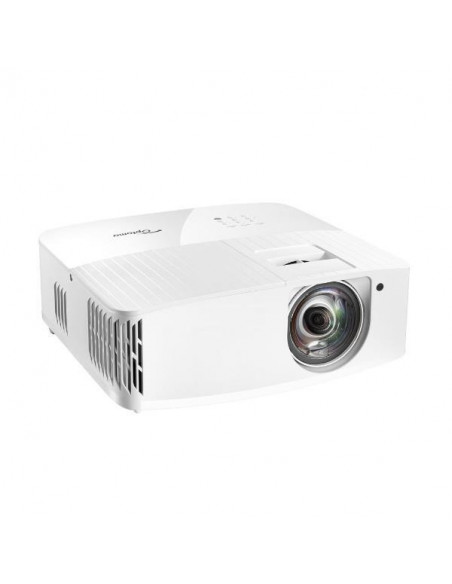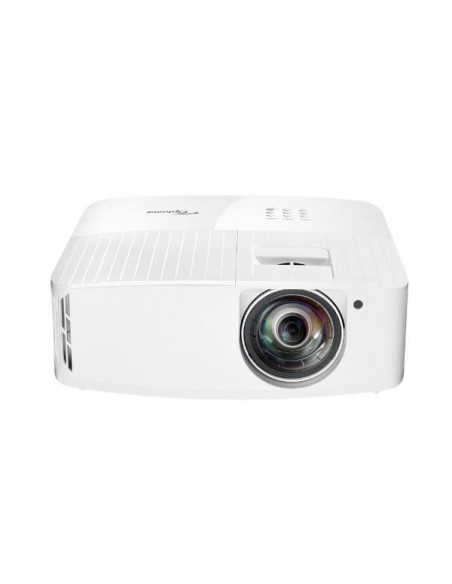 Projetor Optoma UHD35STX, E9PV7KJ01EZ1, com resolução 4K UHD (3840x2160) e tecnologia DLP. Oferece imagens brilhantes e detalhadas, ideal para jogos e apresentações. Projetor de curta distância, alta relação de contraste (1.000.000:1), altifalante integrado de 10W. Garantia de 12 meses.