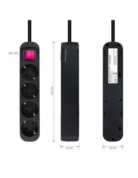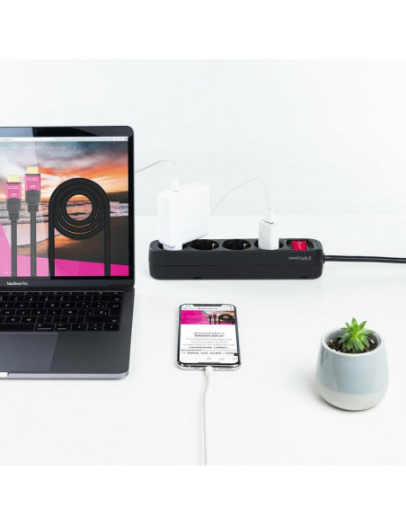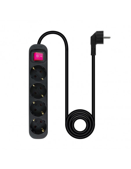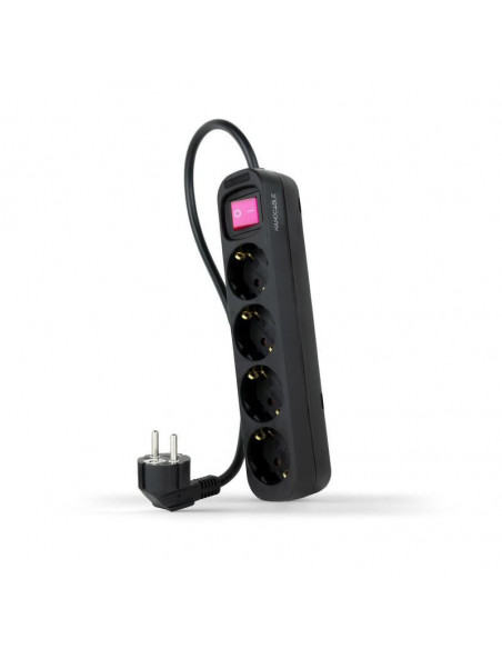 Regista de proteção Nanocable com 4 tomadas Schuko, interruptor liga/desliga e cabo de 1,4m. Ideal para proteção de equipamentos eletrónicos.  Design compacto e elegante em preto.