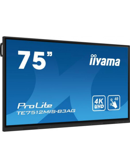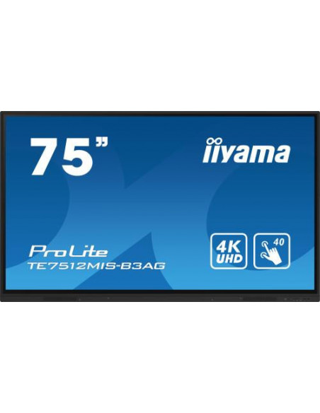 O iiyama TE7512MIS-B3AG é um ecrã de sinalização profissional de design quiosque, com um tamanho de 75 polegadas (190,5 cm) e resolução 4K Ultra HD (3840 x 2160 pixels).  O painel IPS LED proporciona ângulos de visão amplos (178° horizontal e vertical) e cores vibrantes (1,07 biliões de cores). O seu brilho de 400 cd/m² garante legibilidade mesmo em ambientes bem iluminados. Com um tempo de resposta de 8 ms, as imagens são fluidas e sem atrasos. A tecnologia PureTouch-IR touchscreen permite uma interação intuitiva, com 40 pontos de toque simultâneos e um cristal de 3 mm de espessura com filme AG/AR. Integra processador ARM Cortex-A55 quad-core, 8GB de RAM e 32GB de armazenamento interno, com sistema operativo Android 11. Para conectividade, possui 1 entrada VGA, 3 entradas HDMI, 1 entrada USB-C e 5 portas USB 3.2 Gen 1 (3.1 Gen 1). Possui ainda 2 portas Ethernet LAN (RJ-45), saída de áudio, slot OPS e Wi-Fi. O equipamento é construído para funcionamento contínuo (24/7) e inclui 2 altifalantes embutidos de 32W RMS. A sua estrutura robusta e design de quiosque fazem deste ecrã uma solução ideal para ambientes comerciais e de sinalização digital. O dispositivo possui suporte VESA, permite montagem horizontal e é compatível com as normas CB, CE, TÜV-Bauart, EAC, RoHS, ErP, WEEE, REACH e EPA 8.0. Inclui controlo remoto, pilhas, cabos HDMI, de alimentação e USB.