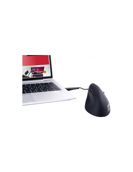 Rato vertical com fio da Urban Factory, modelo Ergo Wired Vertical Ergo Next, desenhado para destros. Oferece 3600 DPI, click silencioso, 6 botões (incluindo dois laterais para navegação), cabo USB-A/C de 1,5m e adaptador USB-C incluído. Cor preta. Garantia de 6 meses.