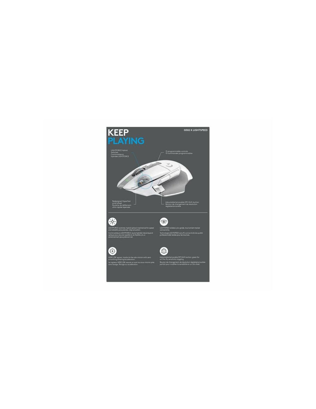 Logitech G G502 X LIGHTSPEED - Rato - óptico - 8 botões - sem fios - 2.4 GHz - recetor USB Logitech LIGHTSPEED - branco