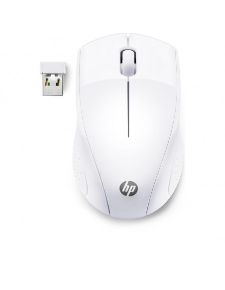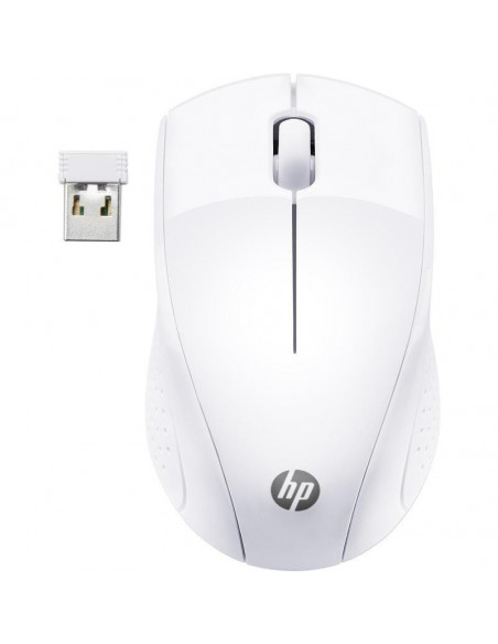 Rato sem fios HP 220, de cor branca, com 3 botões, tecnologia LED azul e sensor óptico de 1600 DPI.  Receptor nano USB incluído.