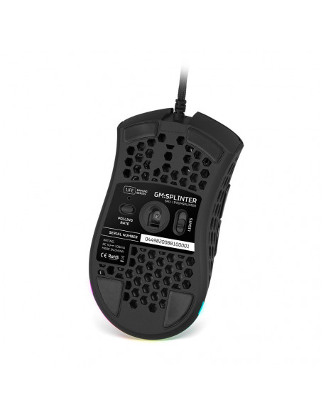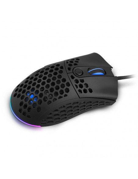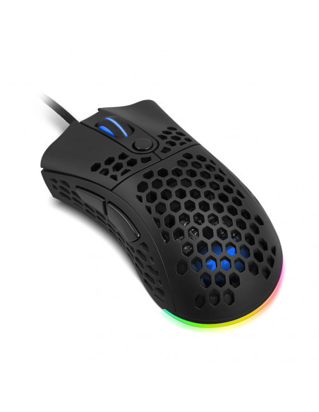 Rato ótico gaming ultraleve, com estrutura perfurada, sensor de 6400 DPI e iluminação dinâmica LED RGB. Software de personalização incluído.