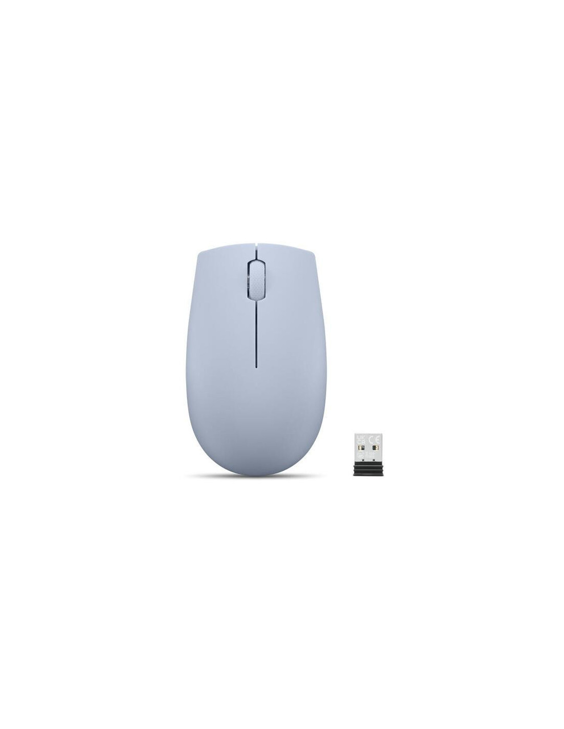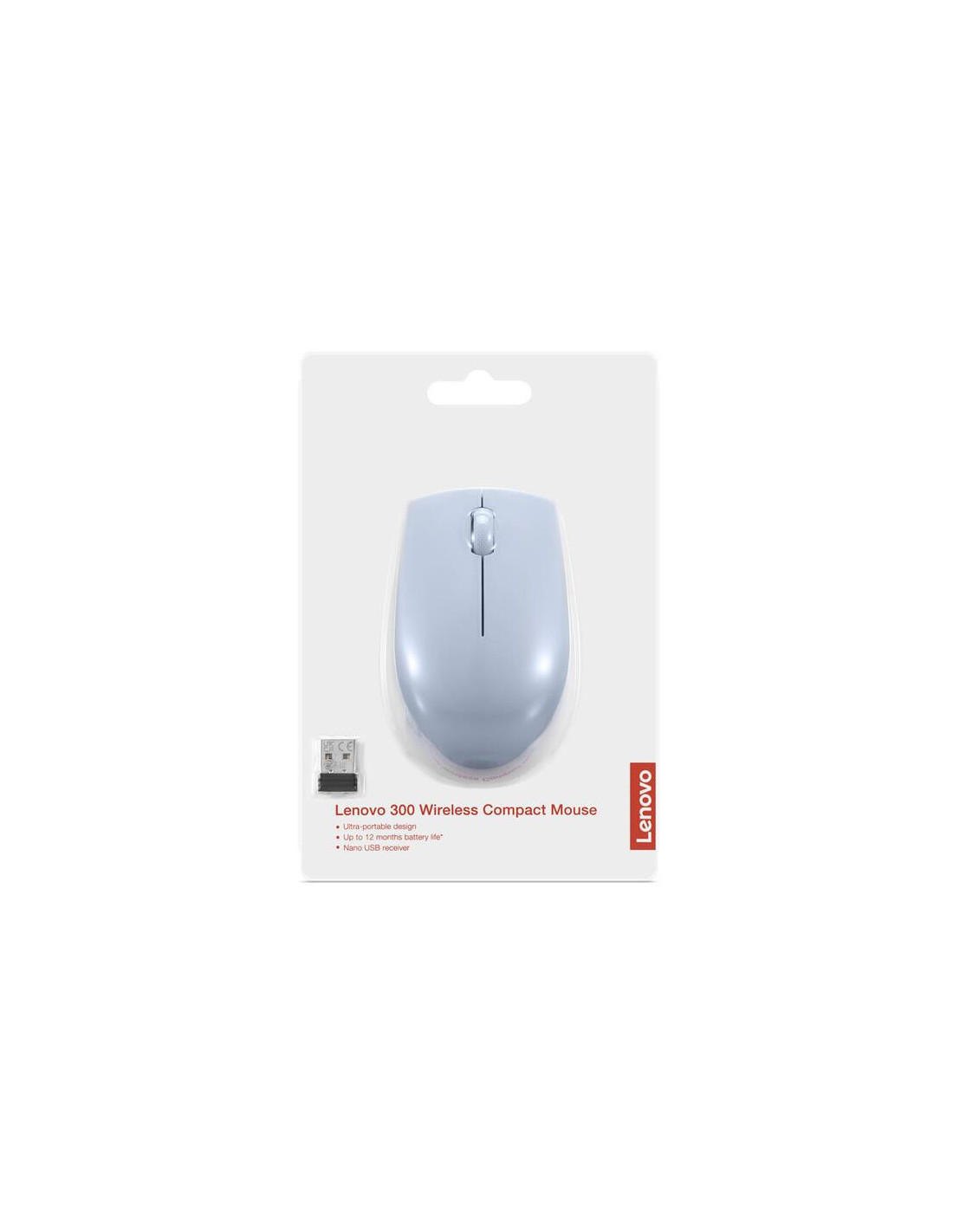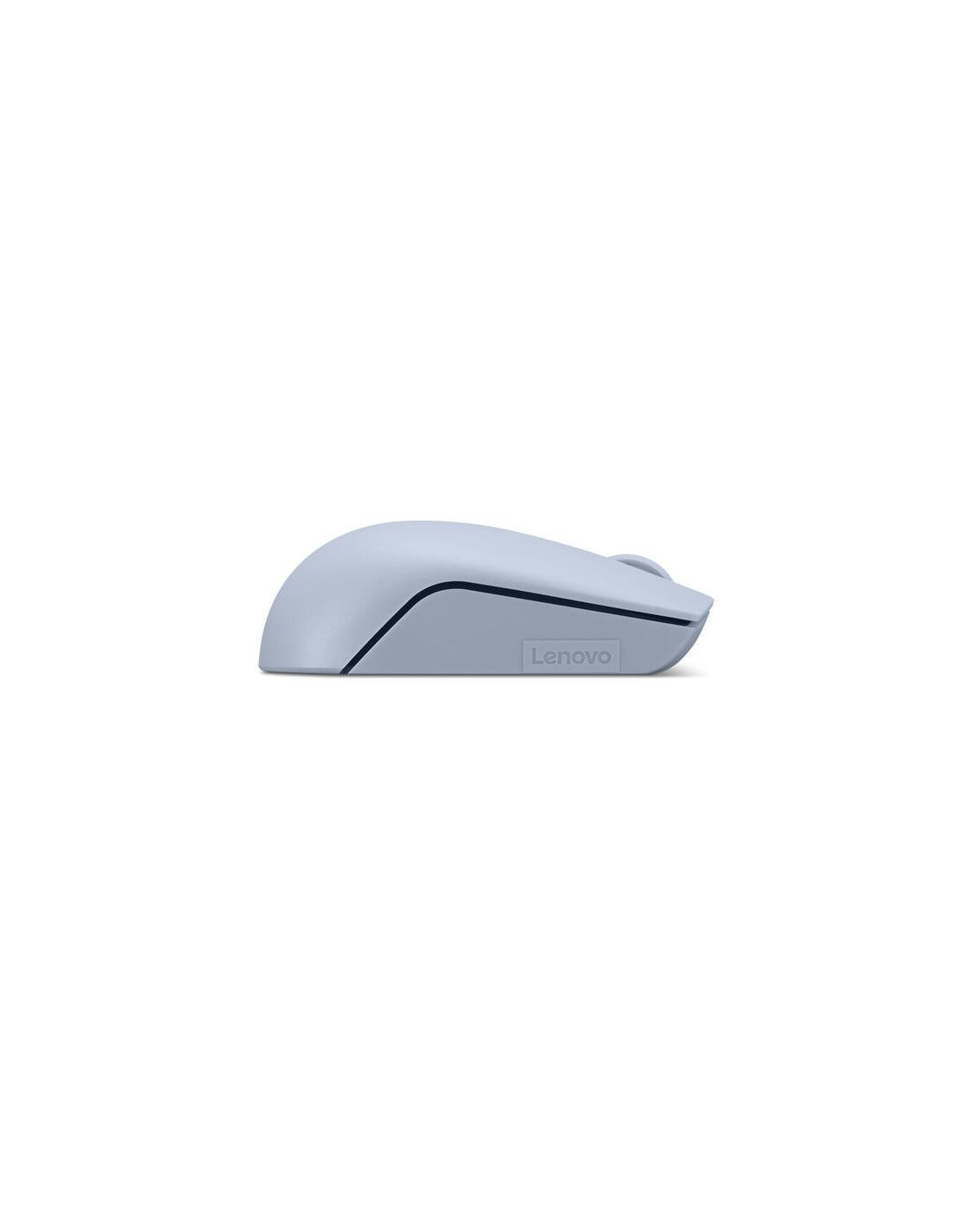Rato sem fio Lenovo 300, compacto e ambidestro, com sensor óptico de 1000 DPI e 3 botões. Ideal para uso em escritório, design azul elegante e funcional.