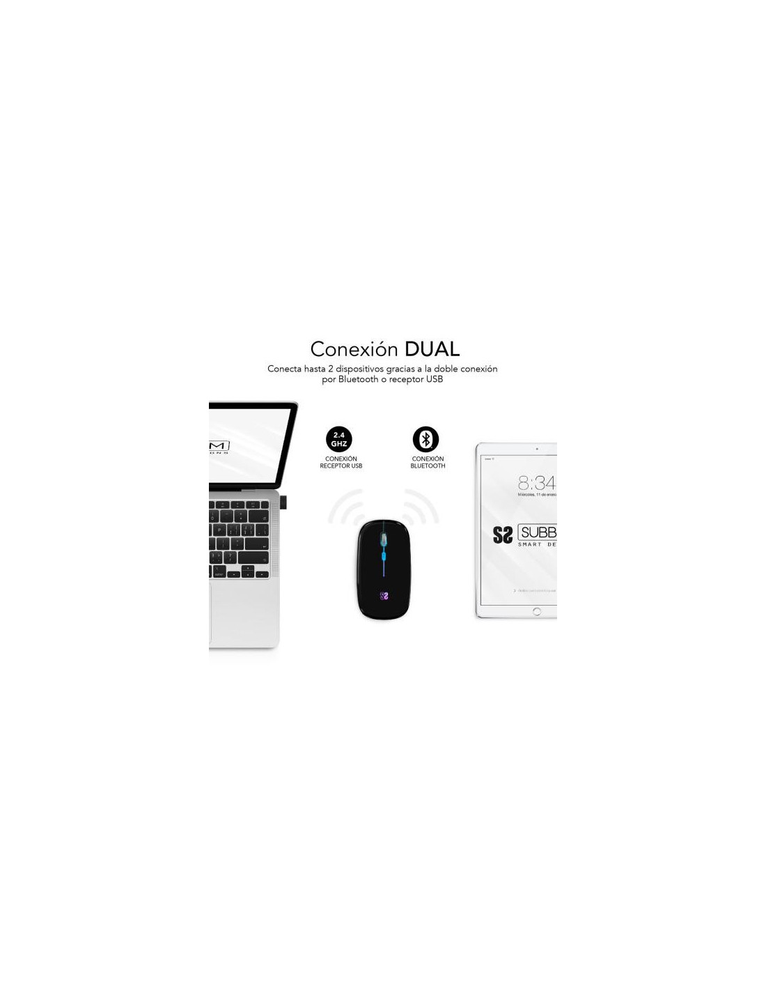 O Rato Óptico Sem Fios Subblim Led Dual Flat Mouse Preto é uma excelente opção para quem procura um rato versátil e confortável, com funcionalidades adicionais que melhoram a experiência do utilizador. A sua conectividade dual permite que o conecte a dois dispositivos simultaneamente, usando tanto a conexão sem fios de 2.4GHz com o seu receptor USB incluído, como via Bluetooth. Esta funcionalidade é especialmente útil para quem alterna entre o computador e o telemóvel, ou tablet, sem ter que mudar de rato.