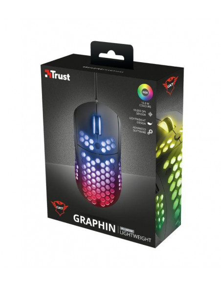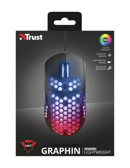 Rato gaming Trust GXT 960 Graphin com iluminação LED RGB, resolução de 10000 DPI e seis botões programáveis. Design para destros, com sensor óptico de alta precisão e interface USB Type-A. Ideal para jogadores que procuram precisão e controlo.