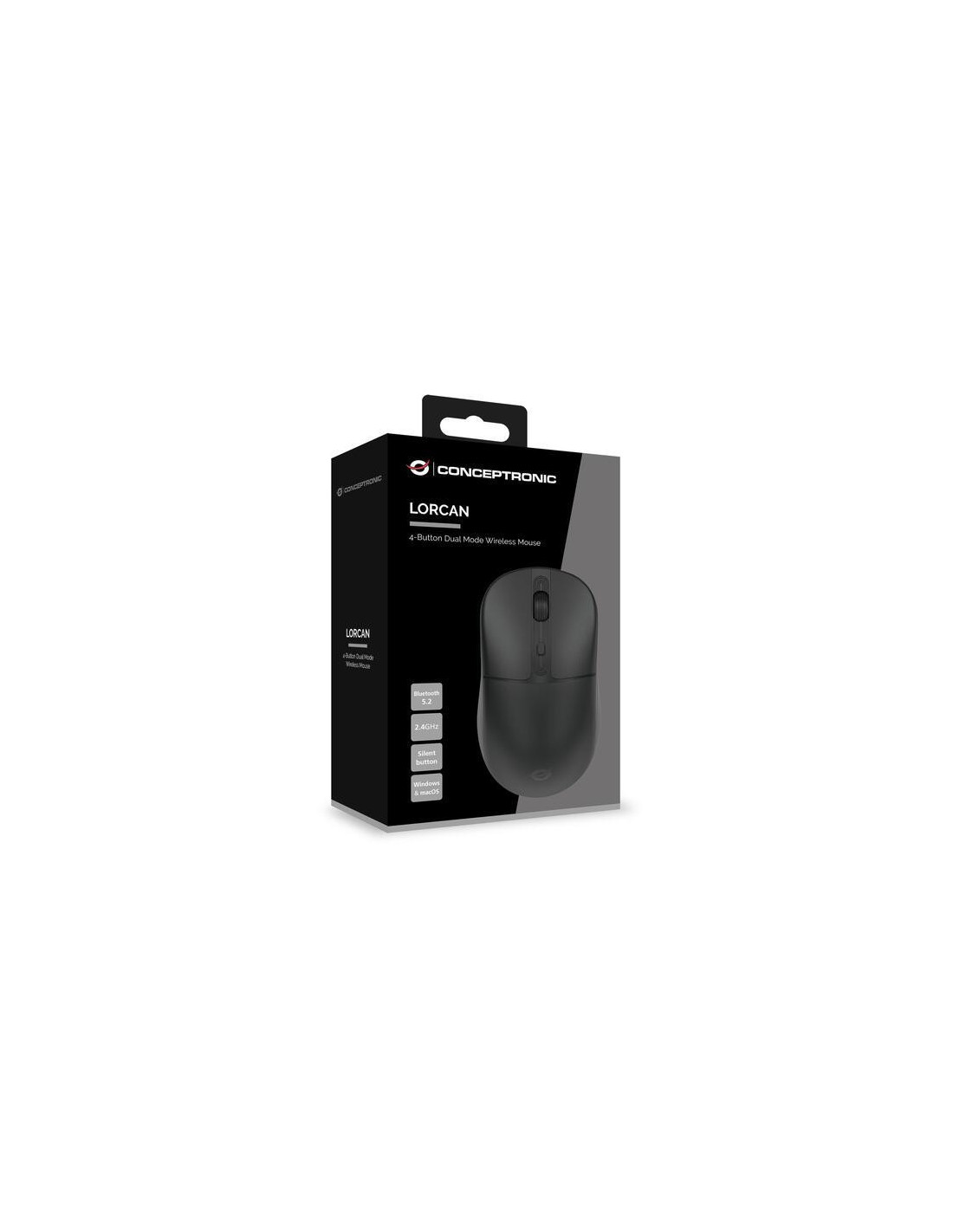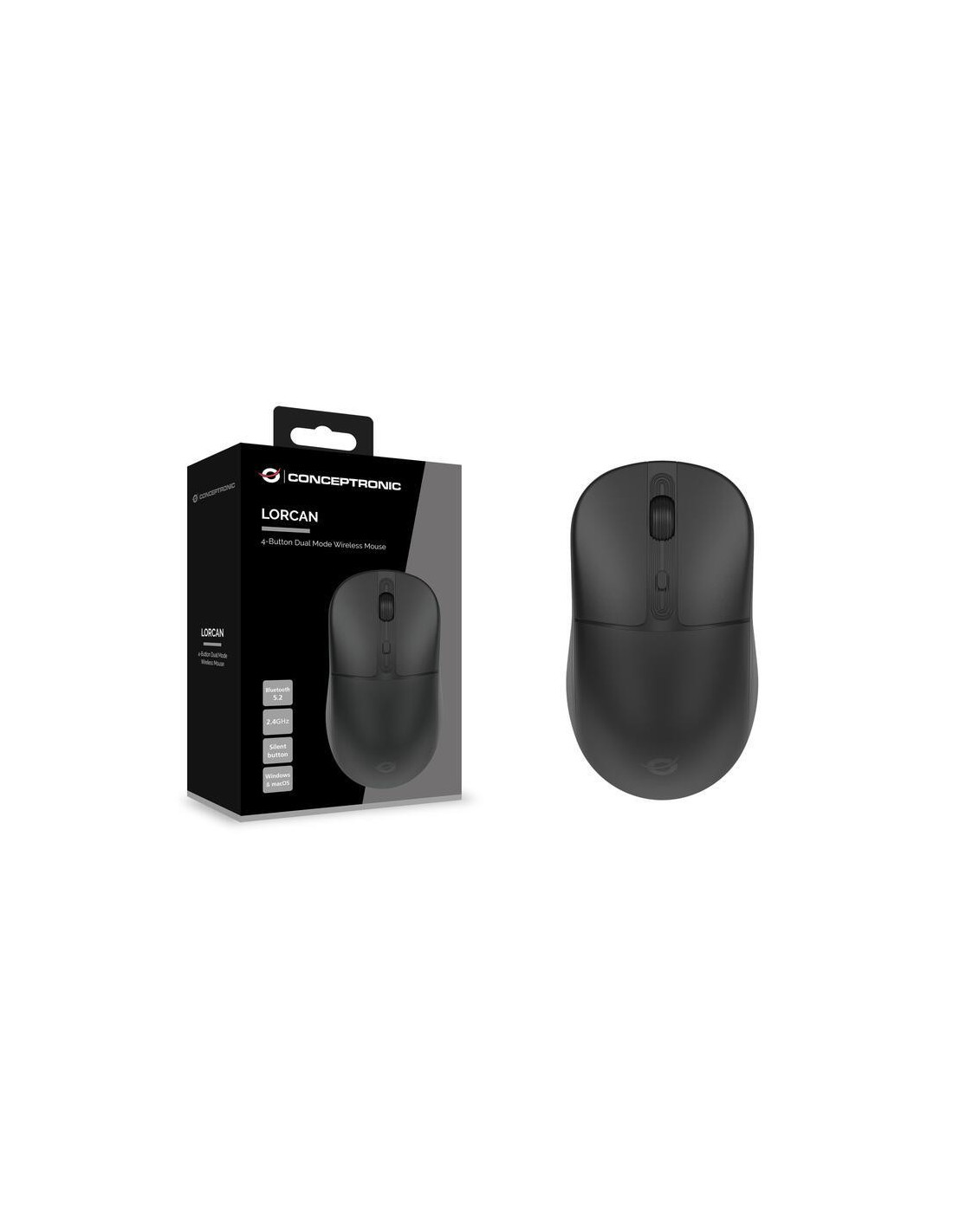 O rato Conceptronic Lorcan04 é um rato óptico sem fios que oferece conectividade tanto via Wireless (2.4GHz) como Bluetooth 5.2. Possui uma resolução de 1600 DPI, permitindo um controlo preciso do cursor. Com quatro botões, permite uma utilização intuitiva e eficiente. É ideal para utilização em computadores de secretária e portáteis, bem como em tablets e smartphones compatíveis. Mais informações podem ser encontradas aqui: (https://www.conceptronic.net/conceptronic_en/lorcan04b-4-button-dual-mode-wireless-mouse-bluetooth-5-2-2-4ghz-120840707101)