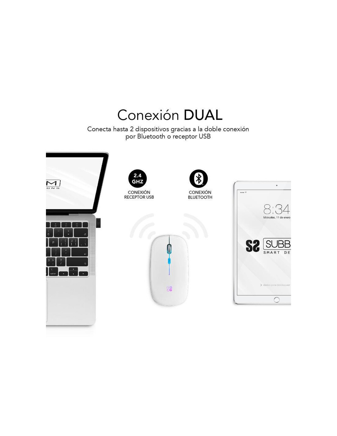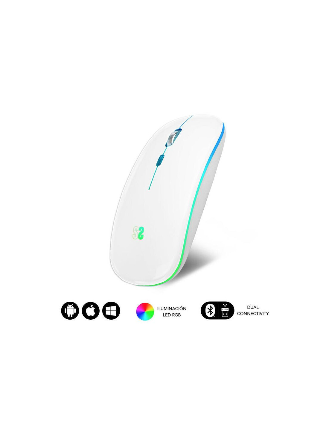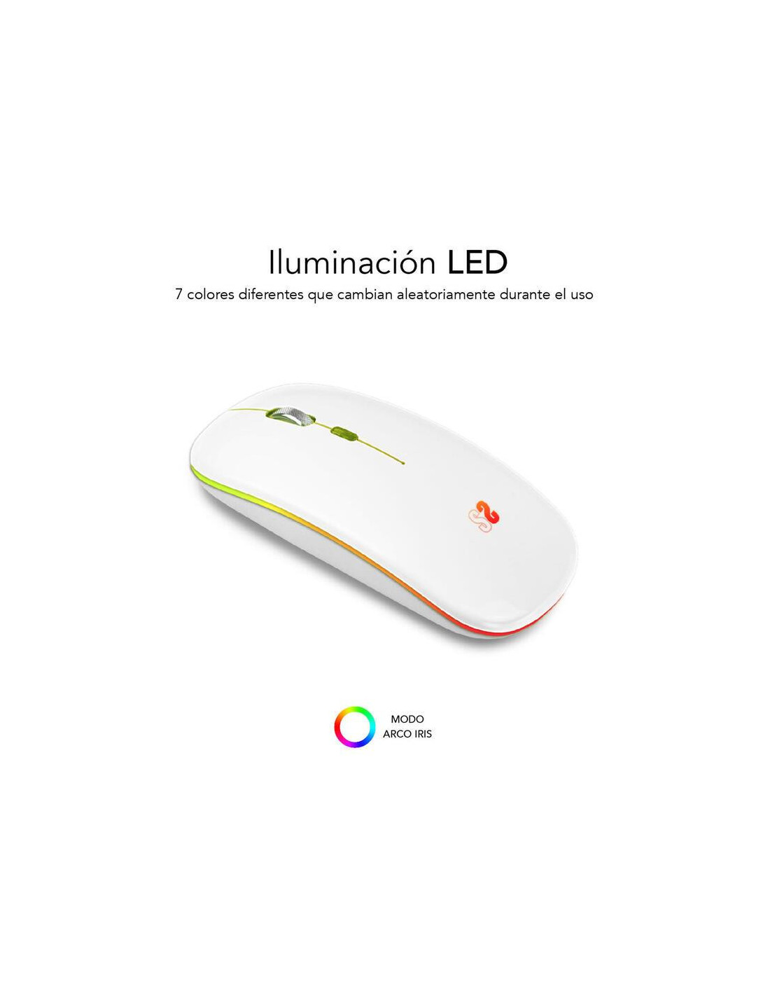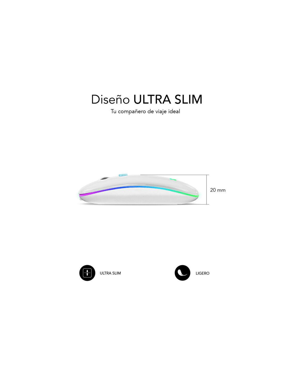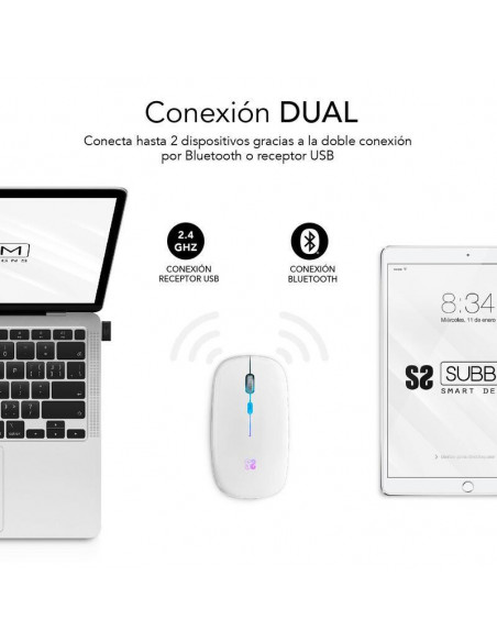 Rato óptico sem fios SUBBLIM com conectividade Bluetooth 5.1 e RF. Design ultrafino e ergonómico, clique silencioso e iluminação RGB em 7 cores. Bateria recarregável de 500 mAh. Resolução até 1600 DPI.