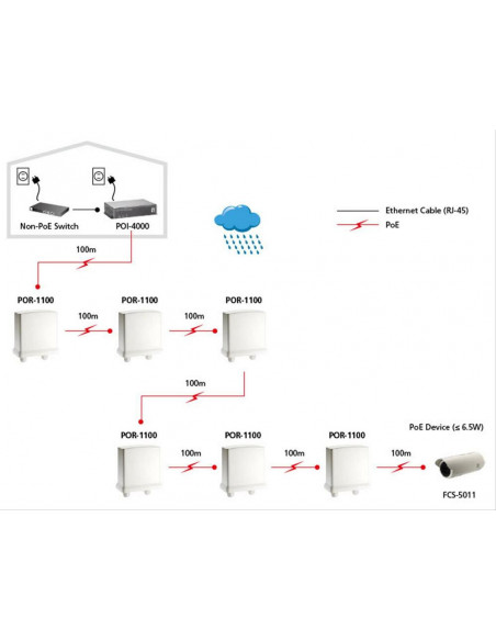 LevelOne Repetidor PoE, Exteriore, Cascade. Tipo: Repetidor de red, Distancia de transferencia máxima: 100 m, Tipos de cable soportados: Cat5. Tecnología de cableado: 10/100Base-T(X), Estándares de red: IEEE 802.3af,IEEE 802.3x. Color del producto: Blanco, País de origen: Taiwán, Certificación: FCC Rules Part 15 CE. Voltaje de salida: 57 V. Ancho: 200 mm, Profundidad: 110 mm, Altura: 240 mm
