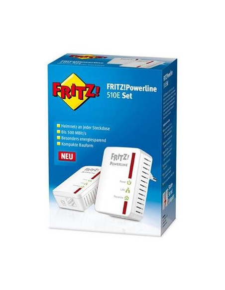 El adaptador FRITZ!Powerline 510E es un dispositivo especialmente compacto que te permitirá ampliar con facilidad tu red doméstica a través de la red eléctrica de tu vivienda. Ofrece una conexión fiable de todos los dispositivos a tu red doméstica, así como una transmisión de datos rápida y estable para disfrutar de cualquier aplicación que desees, ya sea telefonía sobre IP, navegación en Internet, juegos en línea, música o vídeos. Una conexión sencilla a través de la toma de corriente. Sin necesidad de cables adicionales. Transferencias de datos con velocidades de hasta 500 Mbps en la red PLC. Disponible en un práctico kit de iniciación con dos adaptadores.