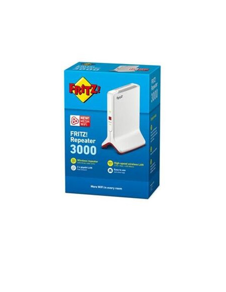 "El repetidor Mesh WiFi más veloz Gracias a sus tres unidades de radio con Mesh repeating inteligente, el FRITZ!Repeater 3000 consigue un gran alcance y una transferencia de datos extraordinariamente elevada en la red WiFi. Su tecnología moderna se adapta especialmente a aquellos usuarios que deseen conectar muchos dispositivos a su red doméstica inalámbrica. &bull, WiFi Tribanda para transmisiones ultrarrápidas, 2 x AC + N, .733 Mbps + 886 Mbps (5 GHz) + 400 Mbps (2,4 GHz), Mesh, para llegar a velocidades de hasta 3000 Mbps y una cobertura óptima y fiable, WPS &bull, Compatible con cualquier router inalámbrico que soporta 802. ac/n/g/b/a, seguridad máxima con WPA2, se adapta perfectamente al FRITZ!Box &bull, 2 x Gigabit LAN: la funcionalidad WiFi estará a disposición de los dispositivos conectados (videoconsolas, ordenadores, Smart TV, etc), Puente LAN como conexión alternativa &bull, LEDs para la visualización de la calidad de conexión y del estado WiFi y que ayudan a encontrar la posición óptima para el repetidor, fácil de instalar con solo presionar un botón"