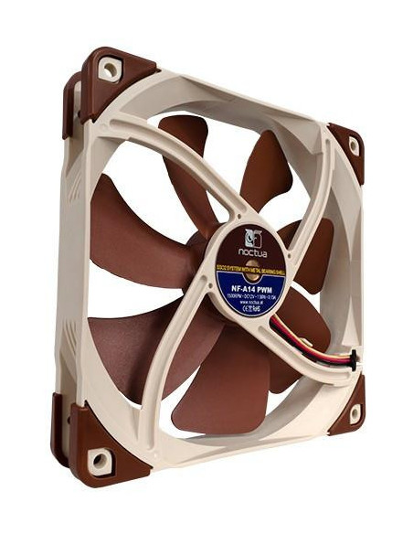 Ventilador Noctua NF-A14 PWM (NF-A14PWM), de 140mm, com controlo PWM para gestão inteligente da velocidade. Oferece um fluxo de ar elevado com baixo ruído, ideal para refrigeração de PCs. Construído em plástico castanho, é uma opção silenciosa e eficiente.