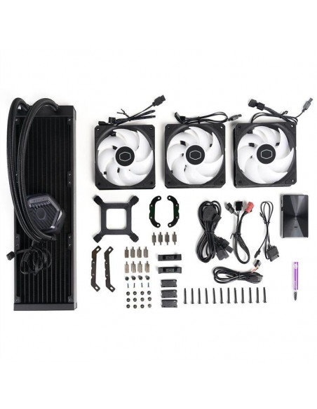 Sistema de refrigeração líquida CPU Cooler Master MasterLiquid 360 Atmos ARGB, com radiador de 360mm e três ventoinhas ARGB para um arrefecimento eficaz e silencioso do processador. Compatível com diversas plataformas de sockets de processador.