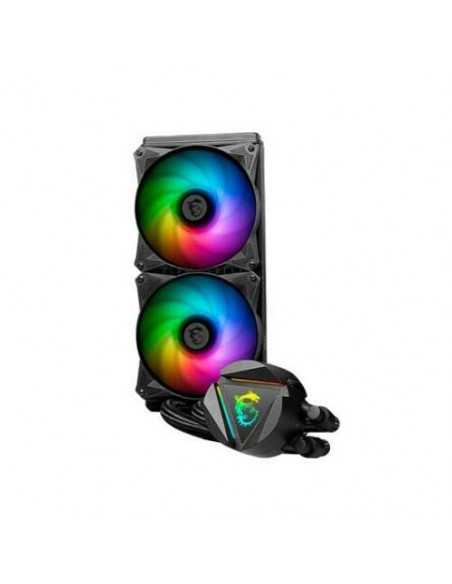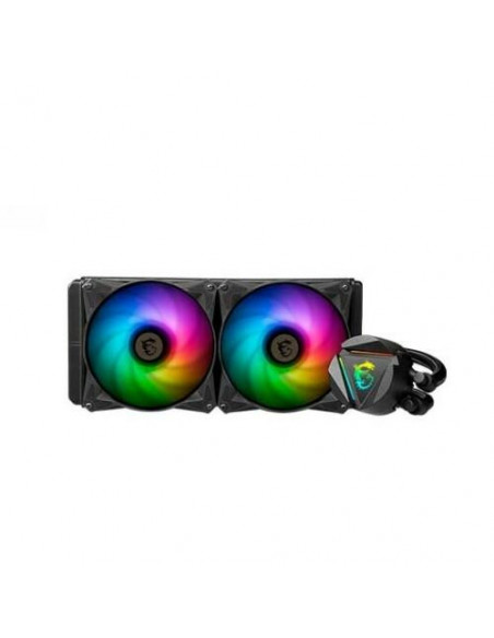 Dissipador de refrigeração líquida MSI MAG Coreliquid 280R V2, com dois ventiladores de 140mm e iluminação ARGB.  Oferece compatibilidade com diversos sockets de processador e um bloco de água também com ARGB. Garantia de 3 anos.