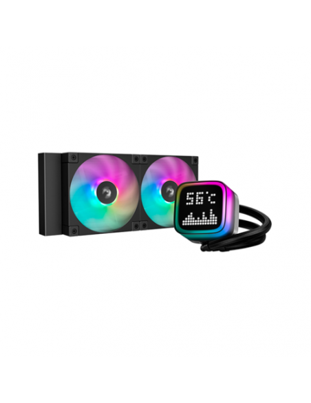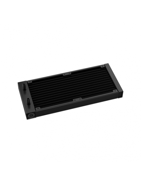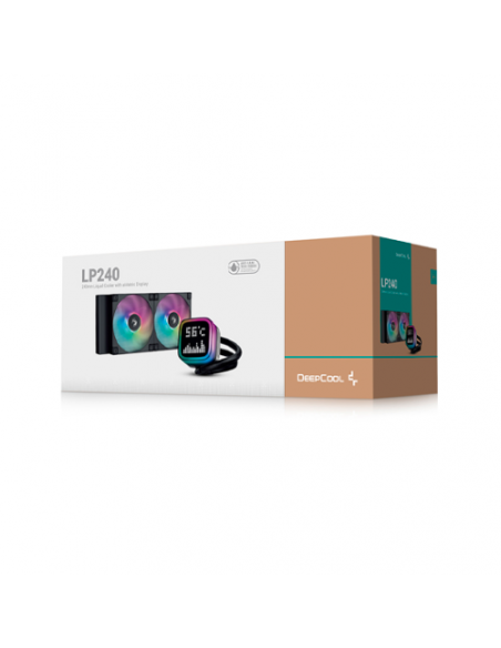 Dissipador de refrigeração líquida Deepcool LP240 Black, com dois ventiladores de 120mm, iluminação RGB e controlo PWM.  Oferece um desempenho de refrigeração eficaz para CPUs, com um baixo nível de ruído.  Fácil instalação e compatível com diversas plataformas.